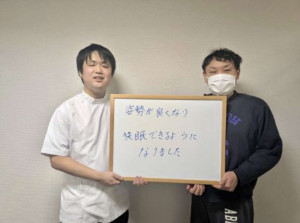 「体の硬直、肩こり、腰痛が改善しました!!!」 体が硬い、肩が凝りやすい、腰痛など様々な悩みがありました。 施術で左右の肩のバランスが悪く、首の後ろもかなり凝っていることに気付きましたが、施術していただいてすぐに改善されました。 今ある症状の改善だけでなく、こんなに自分の体が異常を起こしていることに気付けてよかったと思います。 体の歪みは若いうちに治していける方が良いと実感しました。 少しでも体の痛みがある人が身近にいたら一度診てもらうことをおすすめしたいと思います! (Y.H様 新宿区在住 20代女性) ※効果には個人差があります |
